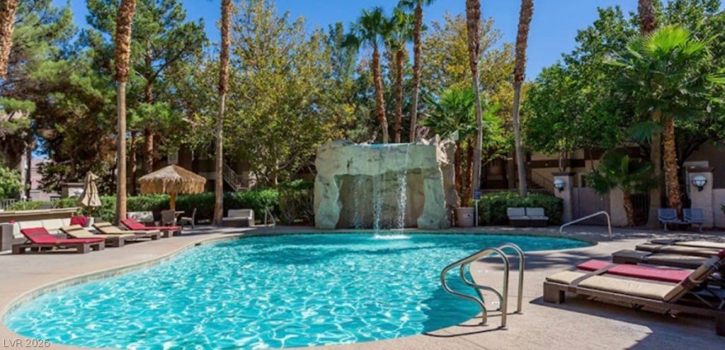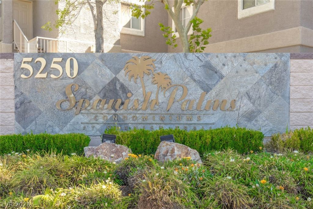 Welcome to this charming 2-bedroom condo in the sought-after Spanish Palms community! Ideally located just minutes from the Las Vegas Strip and top-tier shopping, this guard-gated neighborhood offers resort-style living with amenities such as a sparkling pool, beautifully maintained landscaping, and peaceful, park-like grounds. Inside, the kitchen is equipped with quartz countertops and stainless steel appliances, making it both stylish and functional for daily living and entertaining. The spacious primary suite features a walk-in closet and a private en suite bathroom. The inviting living room boasts a cozy fireplace, perfect for relaxing evenings. Additional highlights include an attached 2-car garage with direct home access and all appliances included, offering comfort, convenience, and move-in-ready ease.